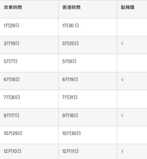 12月12-13日(发布《经济预测摘要》以及点阵图)。