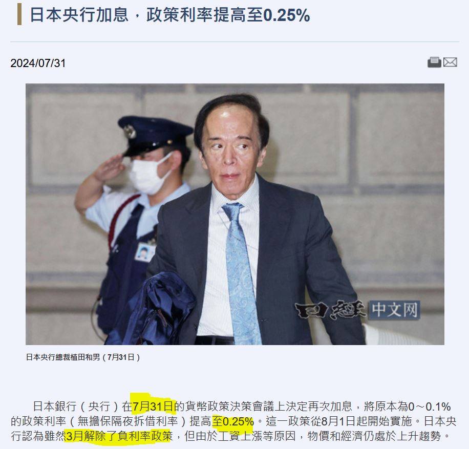 2024年7月31日,日本央行加息,政策利率提高至0.25%