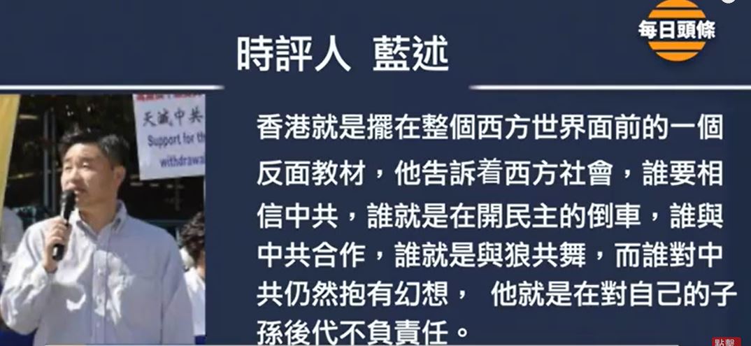 他形容當下香港情況「令人心碎」,因為北京「完全違反」高度自治,而且害怕香港所代表的「自由與公民意識」。