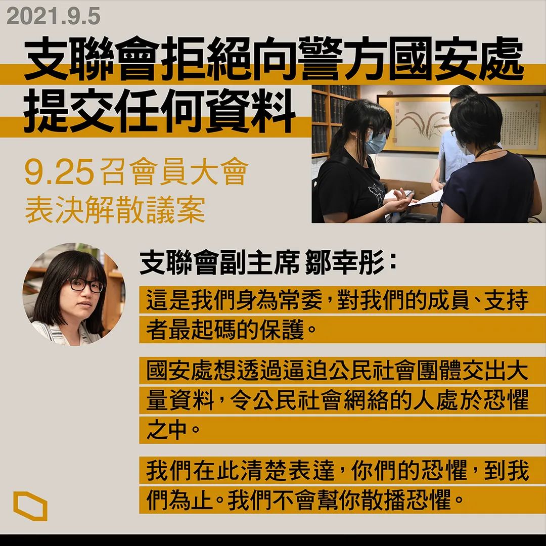 2021年9月,香港支联会副主席邹幸彤重申,支联会只是接受捐款的民间组织,代表香港市民的良知。不是所謂"外国代理人",相关指控并无事实根据。而警方国安处把懷疑當成事實,要求提交資料,也没有法律依据。因此,该会拒绝向国安处提交相关资料。