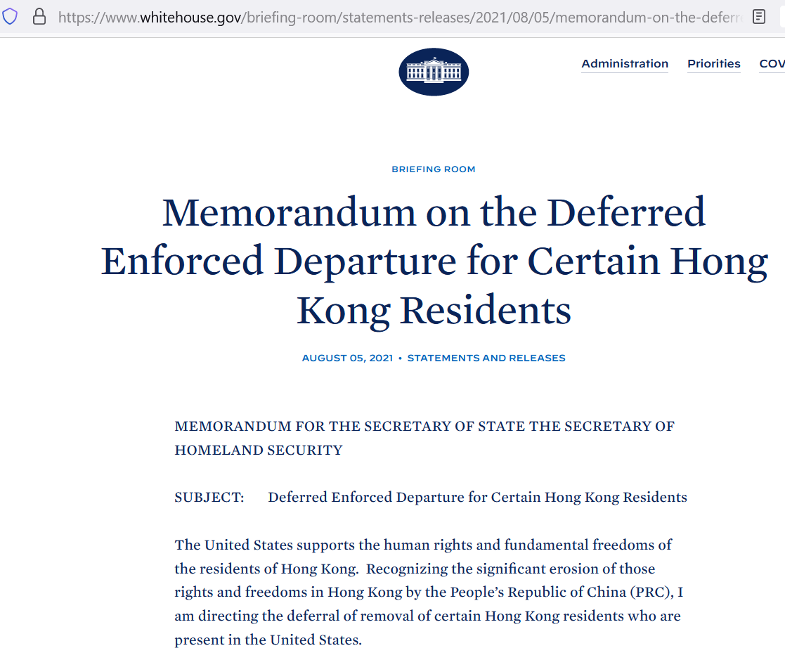 原文source:https://www.whitehouse.gov/briefing-room/statements-releases/2021/08/05/memorandum-on-the-deferred-enforced-departure-for-certain-hong-kong-residents/