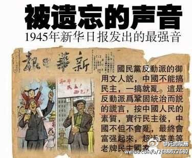"中国的缺点,一言以蔽之,就是缺乏民主。……政治需要统一,但是只有建立在言论、出版、结社的自由与民主选举政府的基础上面,才是有力的政治。"(毛泽东,1944)