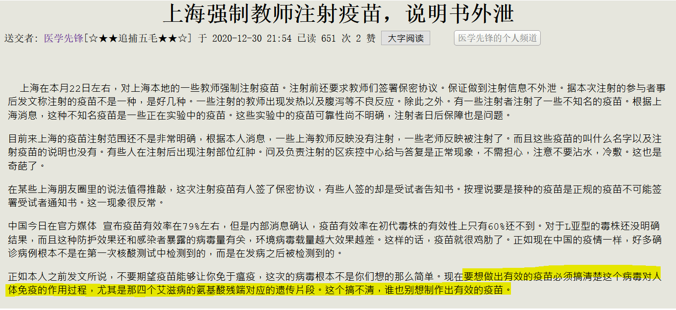 而且本人早在今年三月就已经发文告诫大家不要对疫苗抱有太大希望(本人当时发文链接 https://club.6parkbbs.com/life5/index.php?app=forum&act=threadview&tid=13373829 ; )。疫苗这一问题现在来看正如本人说说效果不好。也正如本人在前段时间给某位网友回复的一样,虽说本人看好mRNA疫苗这一路线但是本人根本不看好现在市面上的任何一款疫苗,因为这些疫苗要达到真正意义上的商品化疫苗还有很大的差距要走。今天有人问我关于美国辉瑞疫苗导致很多人产生副作用的问题,在这里我回答一下。疫苗的过敏不是因为PEG的问题,而是疫苗本身存在的一些特殊蛋白质。这些蛋白质恰好就是病毒的关键信息所在,大家应该都知道,这次病毒会引起很严重的免疫反应,有一些患者的免疫反应类似于过敏或者是结缔组织病的病理过程,然而导致这一现象的就是病毒自身的某些表面蛋白。但是本人并不认为这些蛋白会引起这么严重的且数量如此之巨大的过敏反应。这极可能是疫苗在生产过程中添加的某些佐剂产生的问题。看到美国的新闻FDA已经对此展开调查。相信本人的预测应该在不久就会被印证。这些引起过敏的蛋白成分要是去除的话会大大的降低疫苗的免疫效果,其实这一问题不应该由本人来阐述,应该让范世昌和陈雄智这两个解放军免疫方面的专家来解释。他们俩可是对这个情况非常清楚的,为何陈薇在疫苗开发这块走了和美国一样的mRNA路线?呵呵呵,这个吗,就很有意思了。接下来大家就看吧,这个疫苗漫天飞舞,其实飞到最后说不好会飞成活病毒。