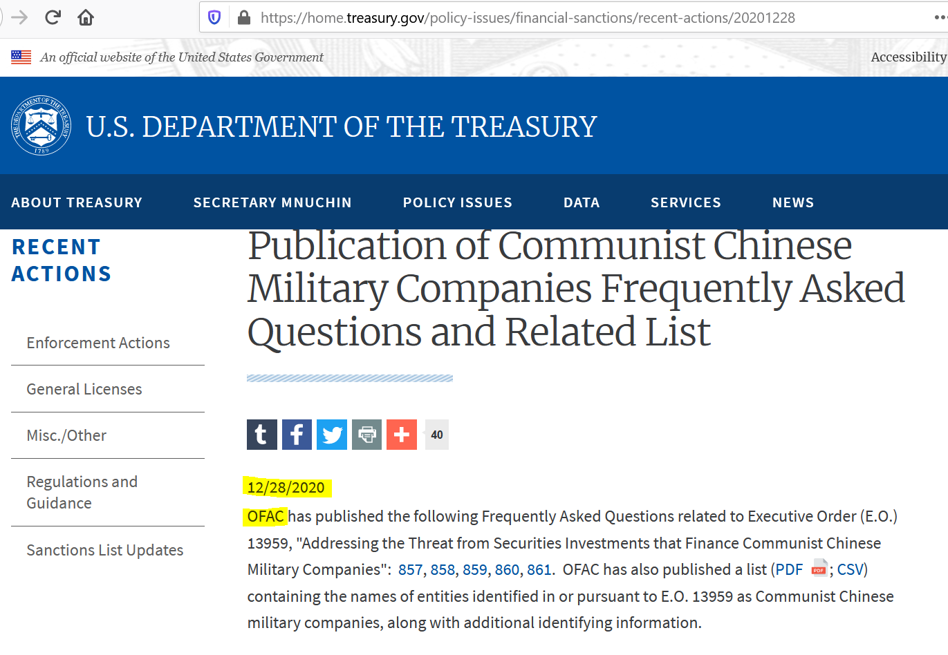 • 2020年12月29日,美國財政部OFAC公佈列入實體清單的共匪企業名單,