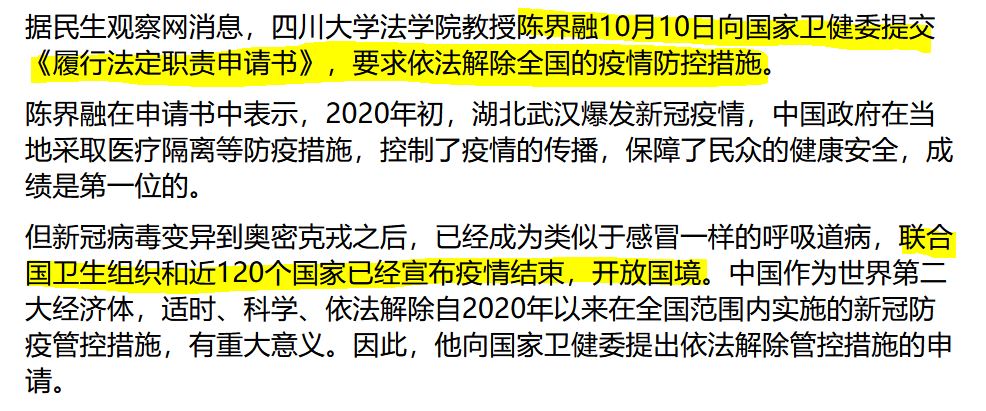 • 四川大学法学院教授陈界融10月10日向国家卫健委提交《履行法定职责申请书》,要求依法解除全国的疫情防控措施。
