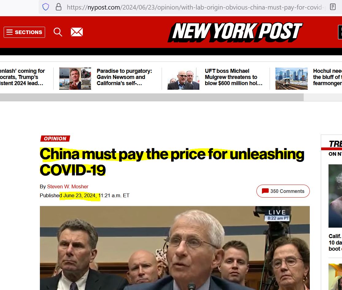 https://nypost.com/2024/06/23/opinion/with-lab-origin-obvious-china-must-pay-for-covid-pandemicchina-must-pay-the-price-for-unleashing-covid-19/
