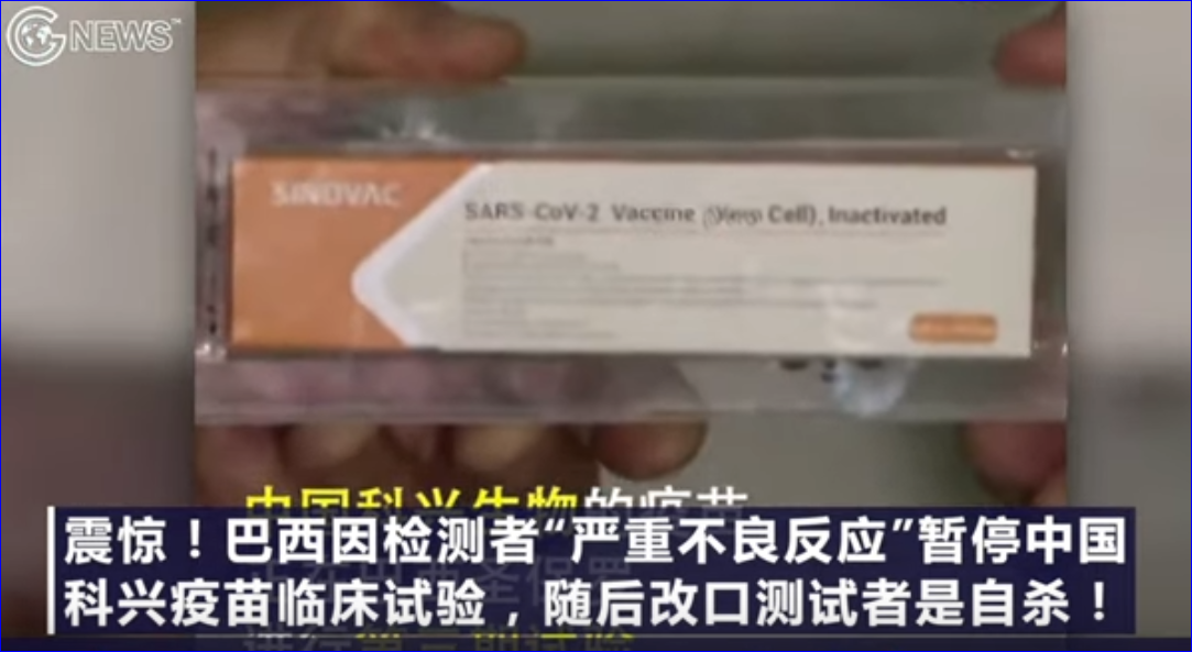 巴西,共匪病毒的"疫苗"因嚴重不良反應而暫停試驗,隨後,改口稱測試者“自殺”。