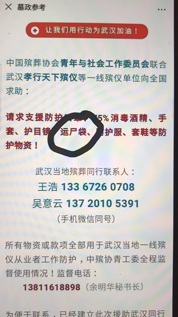 如今,殡仪馆连运尸袋都不够了,希望社会捐助。。。