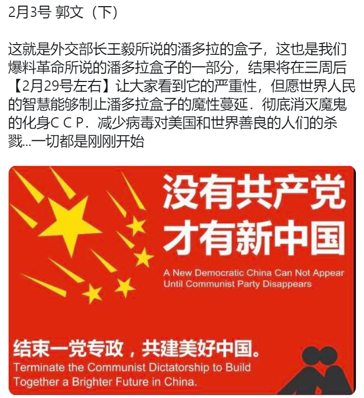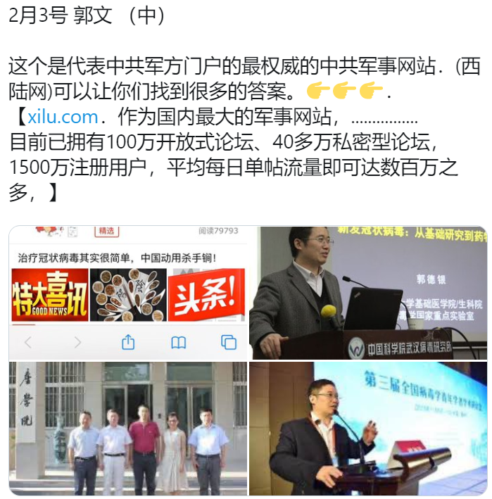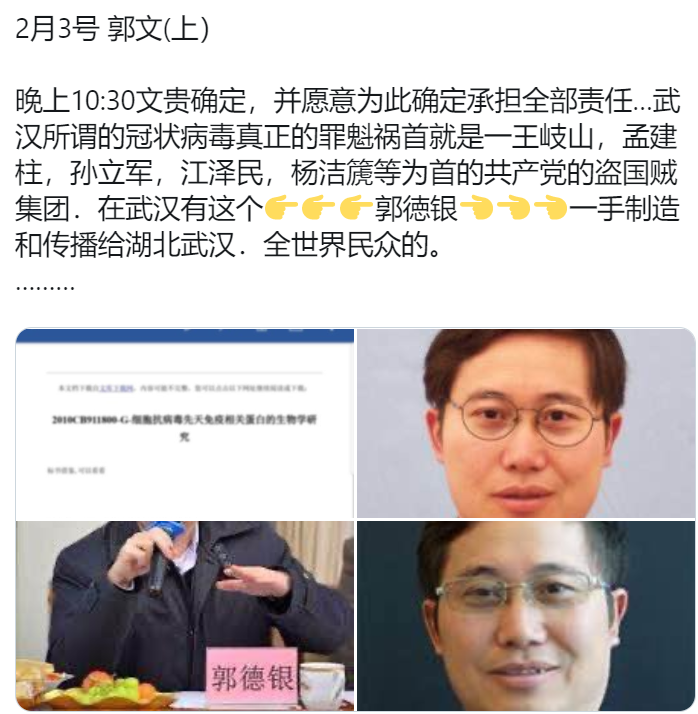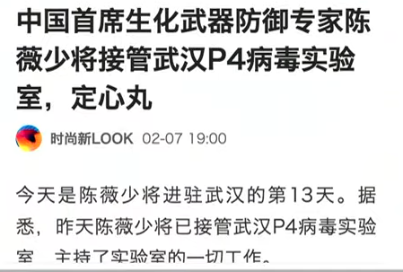 2月6日,中共首席生化武器防御专家,接管武汉P4病毒研究所。