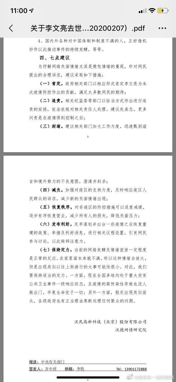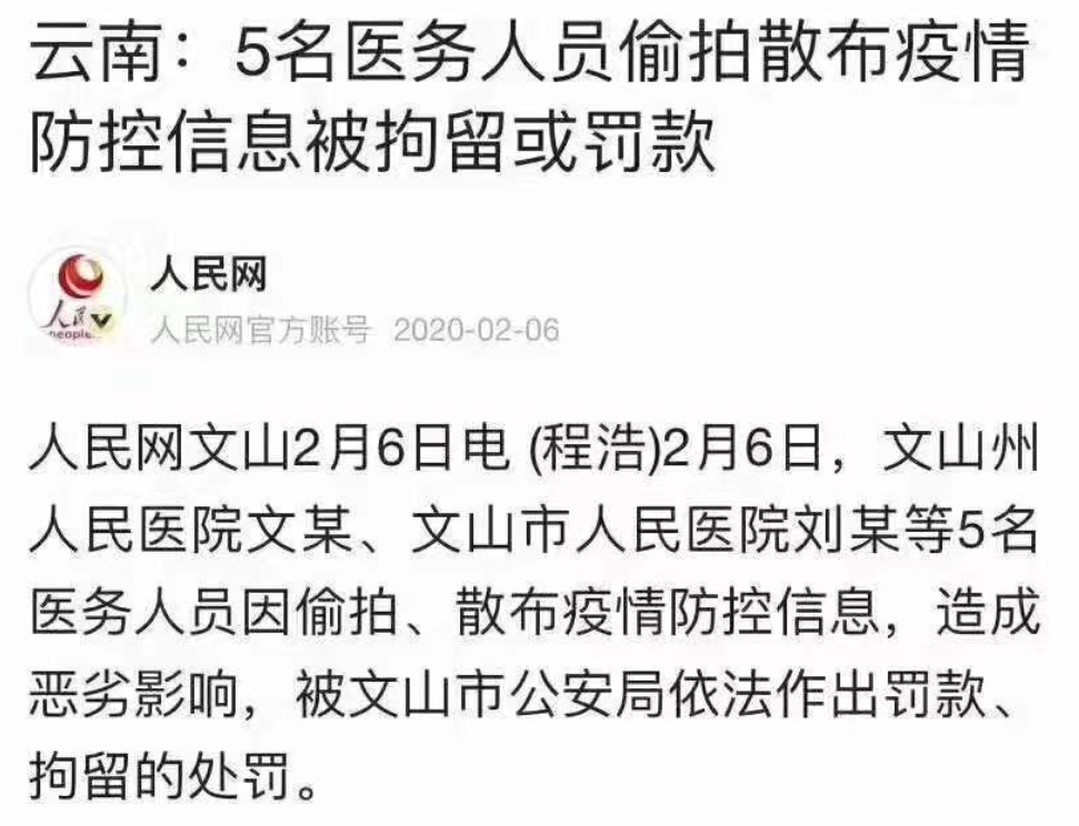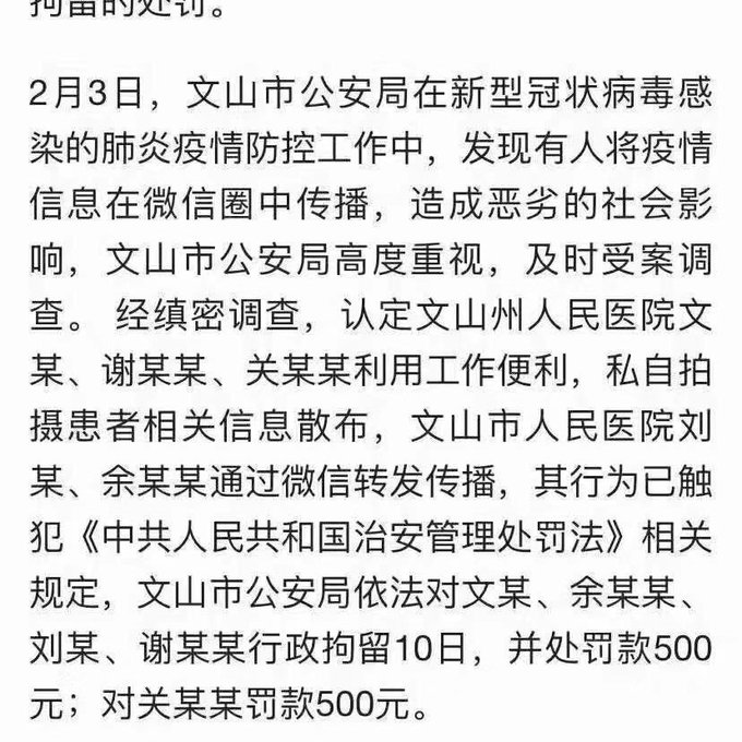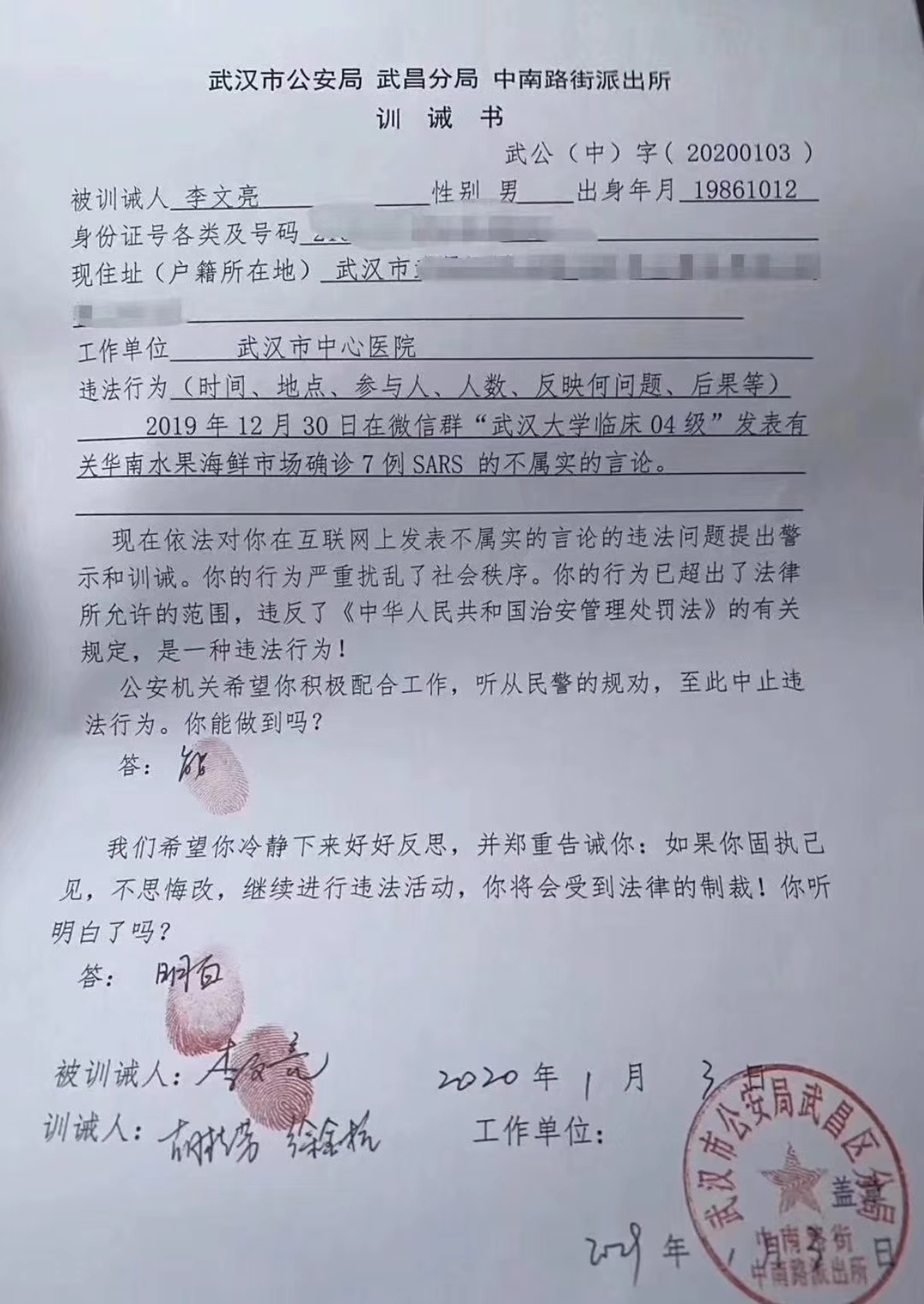 1月1日,李文亮被公安部门以造谣的名义警告和训诫。