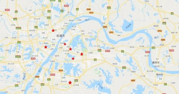 武汉市13日有7区(标记红星处)民众反映听见一声惊天巨响。