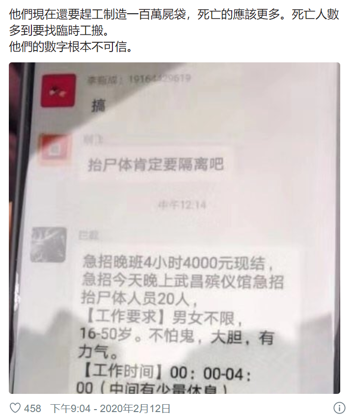 当局临时搭建的“火神山医院”和“雷神山医院”,已经在几天前正式启用,由中共军方接管。其内部视频此前已流出,日前更有自称火神山医院内部人士爆料说,单是火神山医院,每天死亡人数多达数百人。