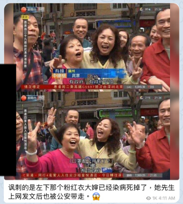 讽刺的是,左下那个粉红衣大婶已经染病死掉了,她先生上网发文后也被公安带走。