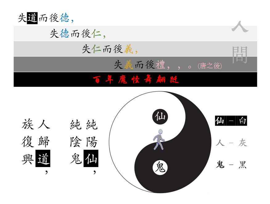 上德不德,是以有德;下德不失德,是以無德。 上德無為而無以為;下德無為而有以為。上仁為之而無以為;上義為之而有以為。上禮為之而莫之應,則攘臂而扔之。 故失道而後德,失德而後仁,失仁而後義,失義而後禮。夫禮者,忠信之薄,而亂之首。前識者,道之華,而愚之始。是以大丈夫處其厚,不居其薄;處其實,不居其華。故去彼取此。
