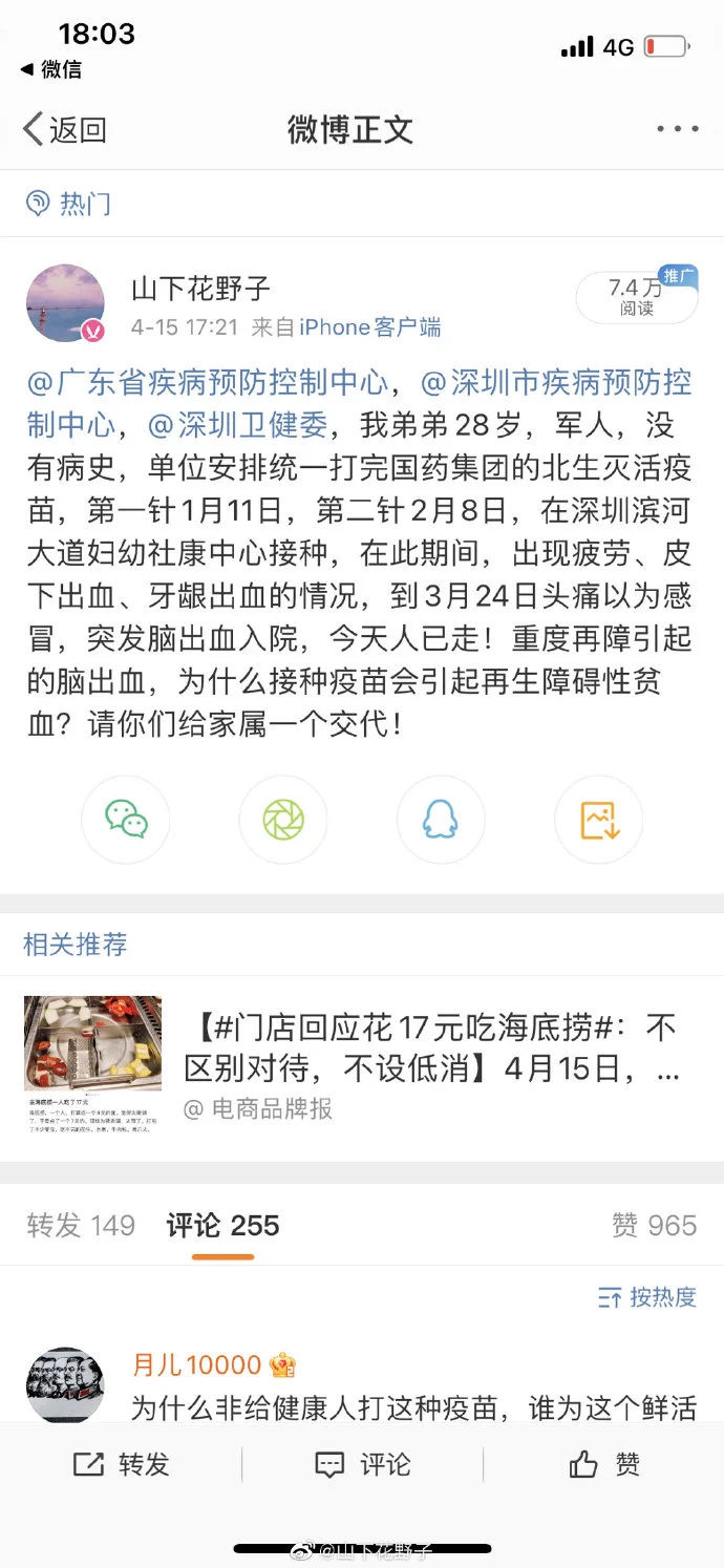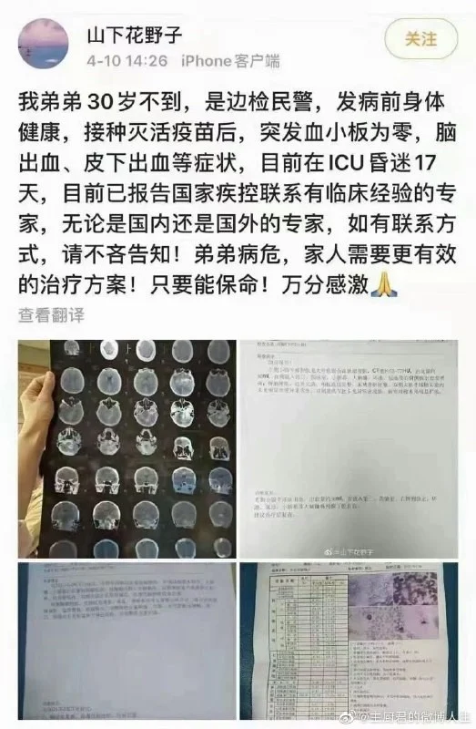 微博用户“山下花野子”4月15日发文称,自己28岁的军人弟弟打疫苗后突发脑出血死亡。该帖随后被删。