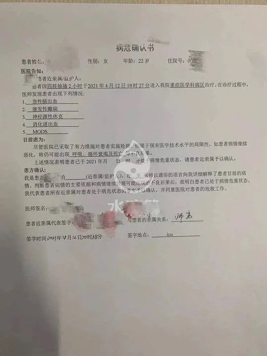 为了证明此事,该网友还发布了一张带有“水滴筹”水印的病危确认书照片。上面显示,病危女生22岁,因为四肢抽搐2小时,于2021年4月12日19时27分送入医院ICU治疗。