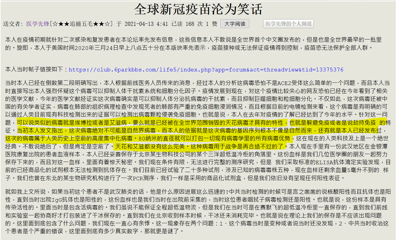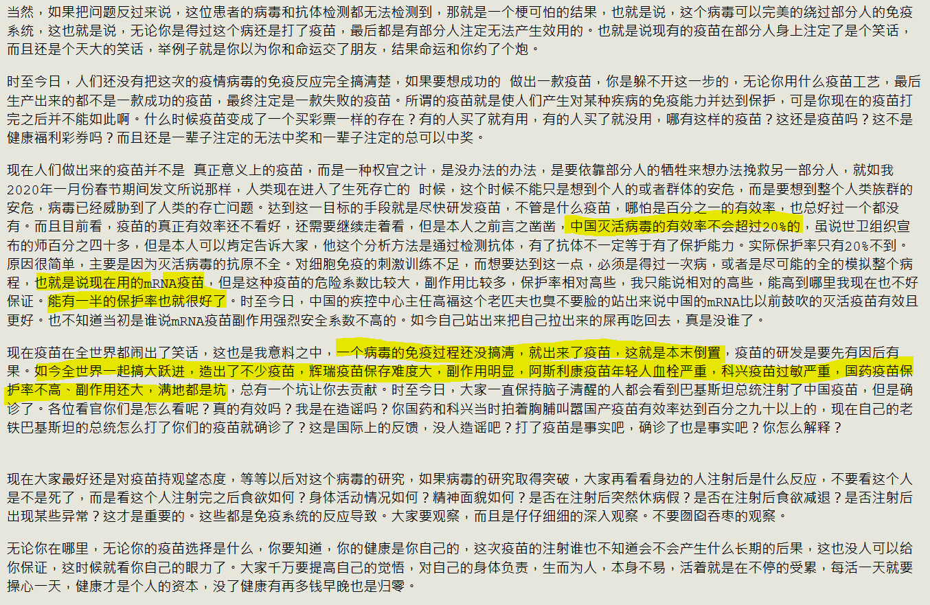 闫博士早就在其报告中指出,在没有调查出中共病毒的真正来源之前,不可能生产出真正有效的疫苗!正如Selling 博士今天发表的声明所说,COVID-19是中共军方军民融合项目的功能性增强实验室的产物,它是一种超限生物武器。所以目前现有的疫苗根本无法完全阻断病毒感染。中共不灭,不可能查清病毒真相,全球大流行就不会停止!