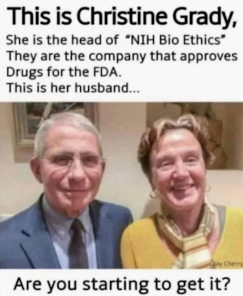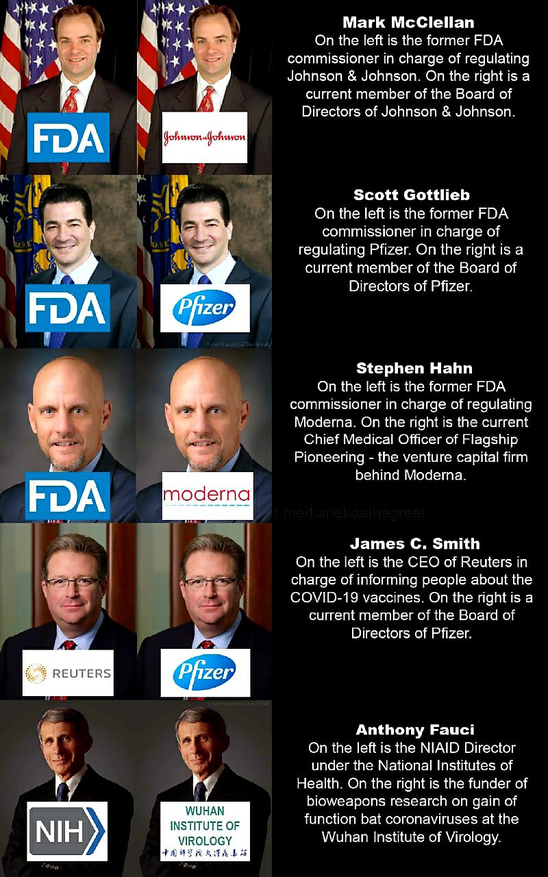 Fauci's NIH funds gain-of-function coronavirus research and simultaneously develops and co-owns coronavirus vaccine technology, while colluding to suppress information about the Wuhan lab leak, and then promotes universal jab mandates.